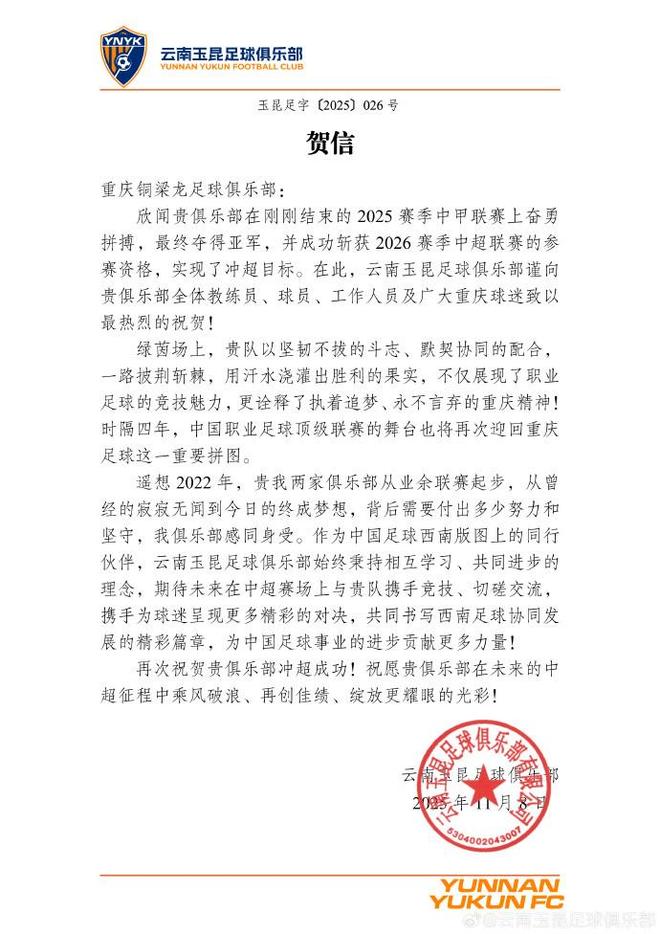 北京时间11月8日,中甲联赛第30轮结束。重庆铜梁龙队在中甲联赛中客场2-0战胜上海嘉定汇龙,以亚军身份晋级中超。赛后,云南玉昆族足球俱乐部向重庆铜梁龙足球俱乐部发来贺信。重庆铜梁龙足球俱乐部恭喜贵队在刚刚结束的2025年中甲联赛中奋力拼搏,获得第二名。他们也获得了参加2026年中超联赛的资格,实现了突围联赛的目标。在此,云南玉昆足球俱乐部向贵俱乐部重庆市全体教练员、球员、工作人员和球迷致以诚挚的祝贺。绿茵场上,他的队员们凭着坚韧不拔的毅力和默契的配合,攻坚克难,挥洒汗水,取得了胜利的成果。这不仅体现了竞争的激烈程度表达了职业足球的强烈感染力,也表达了重庆在追求梦想的过程中永不放弃的精神。四年后,重庆顶级足球拼图将重返中国顶级职业足球联赛的舞台。展望2022年,我们两家具乐部都从业余联赛起步,从默默无闻到如今的梦想。我们的俱乐部对他们背后所需要的努力和耐心也有同样的感受。作为中国足球西南地区的合作伙伴,云南玉昆足球俱乐部始终秉持相互学习、共同进步的理念。我们希望今后能与贵队征战中超联赛,探讨交流,共同为广大球迷呈现更多精彩对决,共同谱写西南足球合作发展的伟大篇章,为中国足球的发展做出更多贡献。更有力量!再次祝贺贵队晋级中超联赛!我们希望您R俱乐部将在未来的中超征程中乘风破浪,再创佳绩,绽放更加璀璨的光芒。云南玉昆足球俱乐部定于2025年11月8日夺得2022赛季冠军(贺词结束)。云南玉坤队获得冠军,重庆铜梁龙队获得亚军。两队共同进入职业联赛。如今,两队将在下赛季的中超联赛中再次相遇。