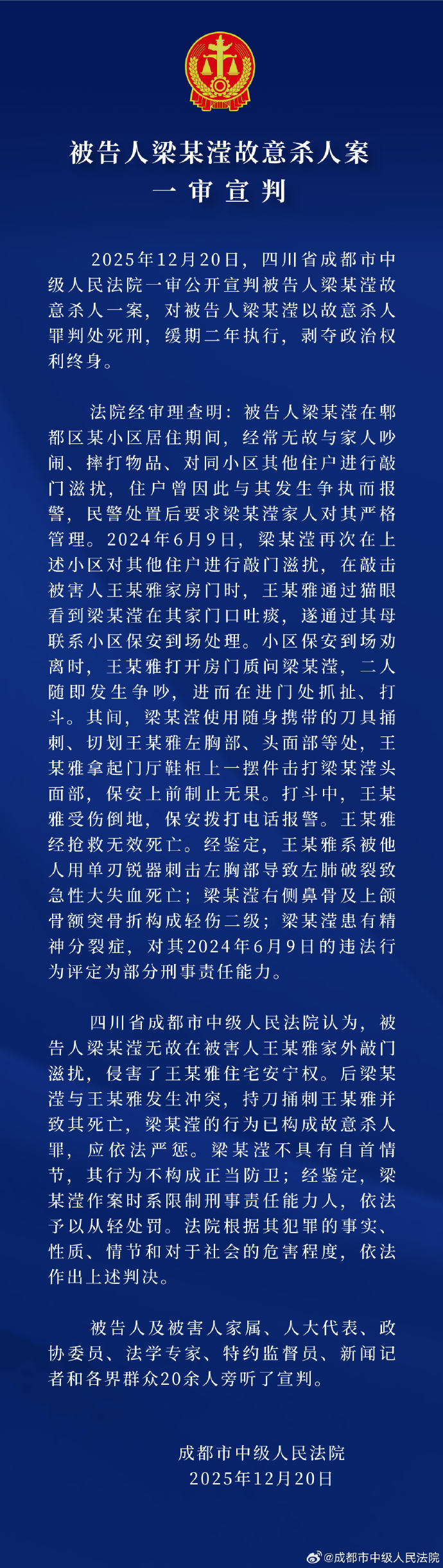 新京报讯 据四川省成都市中级人民法院官方微博报道,2025年12月20日,四川省成都市中级人民法院公开宣判被告人梁某英故意杀人案一审判决。被告人梁某英犯故意杀人罪,被判处死刑,缓期二年执行,剥夺政治权利终身。法院经审理查明,被告人梁某英在成都市郫都区某小区居住时,经常与家人吵闹、摔坏东西,无故撞倒同小区其他居民。居民曾因与他发生争执而报了警。警方处理后,要求梁某英家人严格监管。 2024年6月9日,梁某英再次敲门,对上述小区其他居民造成骚扰。敲门时在受害人王某亚家门口,王某亚通过“猫眼”看到梁某英往自家门上吐口水,于是通过母亲联系社区保安监控现场。当社区保安过来劝其离开时,王某亚打开门质问梁某英。两人立刻打了起来,然后在门口扭打起来。其间,梁某英用随身携带的刀对王某亚的左胸、头部、脸部进行刺砍。王某亚从门厅鞋柜中取出一个空心饰物,击打梁某英的头部和面部。保安上前阻止,但没有任何作用。战斗中,王某亚受伤倒地。保安报了警。王某亚经抢救无效身亡。经查明,王某亚是被另一人用利器刺伤左胸,导致左肺破裂。并导致严重失血。梁某英右鼻骨及上颌额突骨折,构成轻微二级伤;梁某英患有精神分裂症,其2024年6月9日的违法行为被评定负部分刑事责任。四川省成都市中级人民法院认为,被告人梁某英无故敲开被害人王某亚家的门,造成滋扰,侵犯了王某亚的安宁居住权。随后,梁某英与王某亚发生冲突,持刀刺伤王某亚,致王某亚死亡。梁某英的行为已构成故意杀人罪,应当依法严惩。梁某英不具备自首情节,其行为不构成正当防卫;经鉴定,梁某英犯罪时属于有限刑事责任人,依法从轻处罚。法院根据犯罪的事实、性质、情节和社会危害程度,依法作出上述判决。被告人、被害人家属,全国人大代表、政协委员、法律专家、特约监察员、记者和社会各界人士等20余人旁听了庭审。陈彦廷主编的被告人梁某英故意杀人案的解说