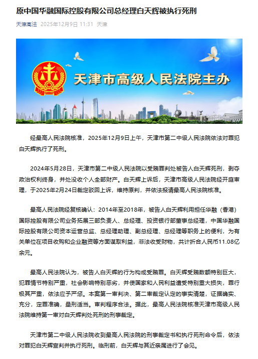 新京报讯 据天津市高院报道,经最高人民法院批准,2025年12月9日上午,天津市第二中级人民法院对罪犯田辉依法执行死刑。 2024年5月28日,天津市第二中级人民法院以受贿罪判处被告人白辉死刑,剥夺政治权利终身,并处没收个人全部财产。天汇上诉后,天津市高级人民法院开庭审理,于2025年2月24日裁定驳回上诉,维持原判,并依法报请最高人民法院核准。最高人民法院经查明,2014年至2018年,被告人田辉利用担任华融(香港)业务发展三部部长、总经理、投资银行部董事总经理的职务便利,ong)国际控股有限公司在项目收购及企业融资等方面为相关单位谋取利益,非法收受财物共计11.08亿余元。最高人民法院认为,被告人田辉的行为已构成受贿罪。天慧收受贿赂数额特别巨大,犯罪情节特别严重,社会影响特别恶劣,国家和人民利益遭受特别重大损失。其犯罪行为极其严重,应当依法严惩。本案一审判决、二审判决认定的事实清楚,证据确实、充分,定罪准确,量刑适当。检测程序合法。据此,最高人民法院同意天津市高级人民法院维持一审判决白天慧的刑事处罚。接到最高人民法院的刑事裁定书和执行令后,天津市第二中级人民法院依法对罪犯白天慧予以处罚并执行。行刑前,白天慧会见了自己的近亲。编辑刘嘉妮